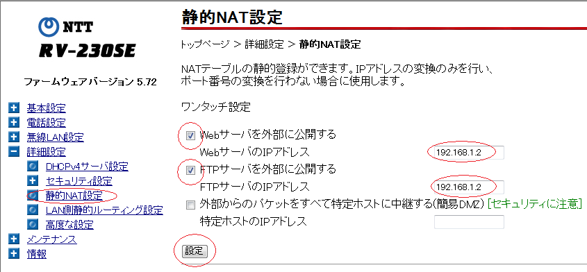 80番ポート(www)を開く場合は「Webサーバーを外部に公開する」にチェックを入れて公開するPCのIPアドレスを入力します。