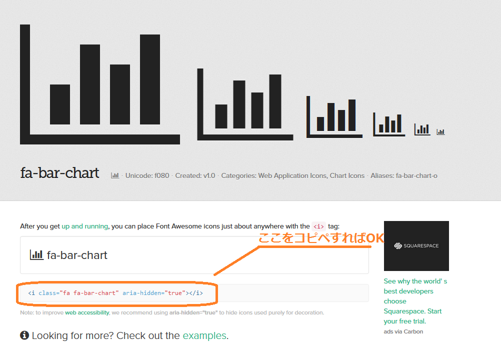 クリックすると下の方にアイコンを表示させるためのタグが発行されますので、そのままコピーして使いたい所に貼り付ければ完成です。