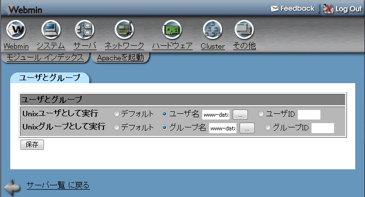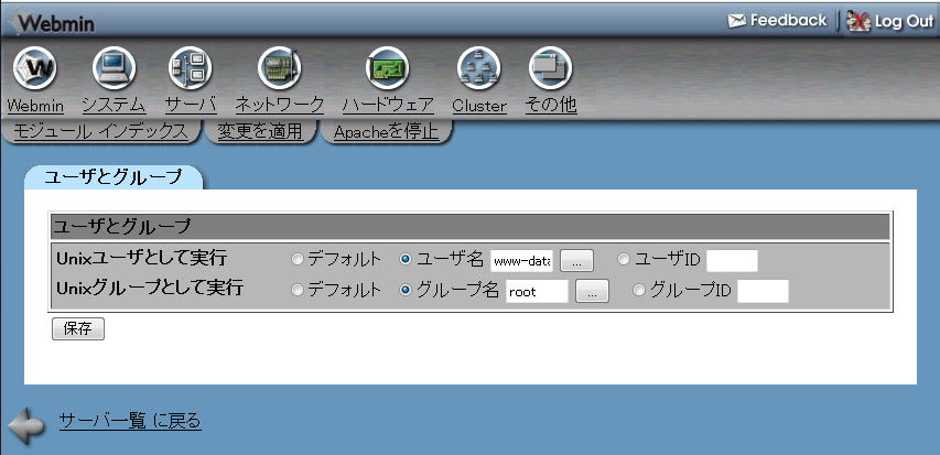 なにやらユーザーの設定が関係してるようだったのでwebminからapache2の設定をいじってみた。