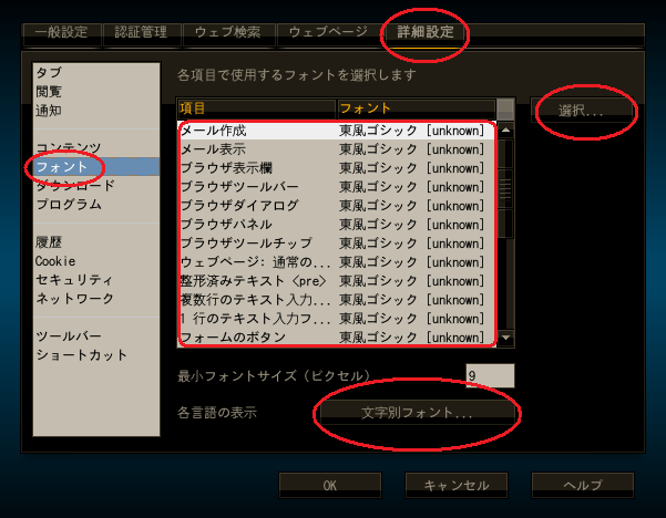 「詳細設定タブ→フォント」に戻って文字選択をクリックします。