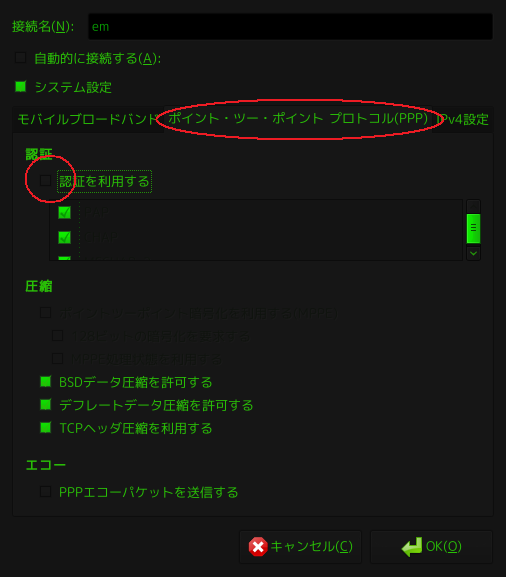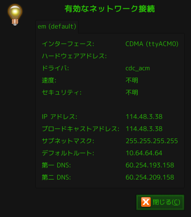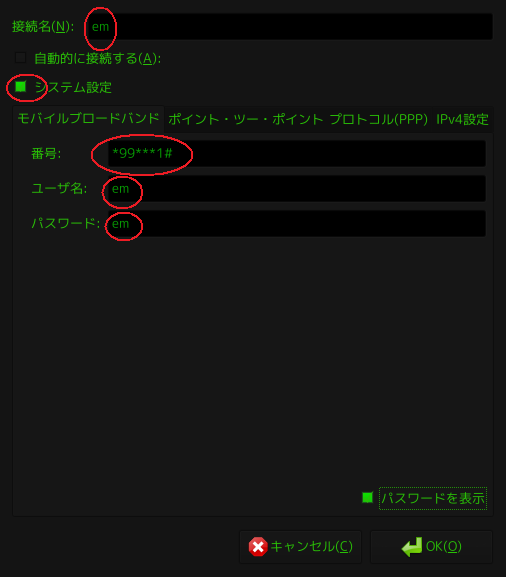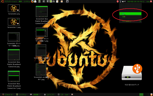 再度ネットワークアイコンをクリックすると、先ほど作ったem接続ができていると思いますのでクリックし、アカウントパスワード(ubuntuのパスワード)を入力すれば正常に接続できるはずです。