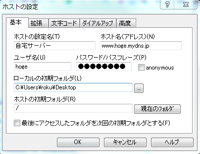 クライアント側のFFFTPの設定は普通のレンタルサーバーやホームページスペースと同じようにホストとユーザーとパスワード設定するだけです。