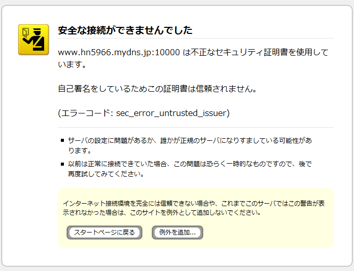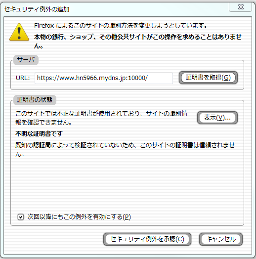 セキュリティー警告が出ますので、例外を追加ボタンを押して証明書を取得します。