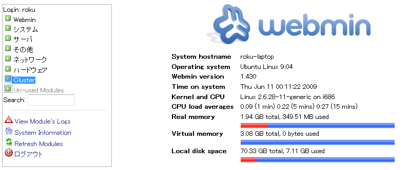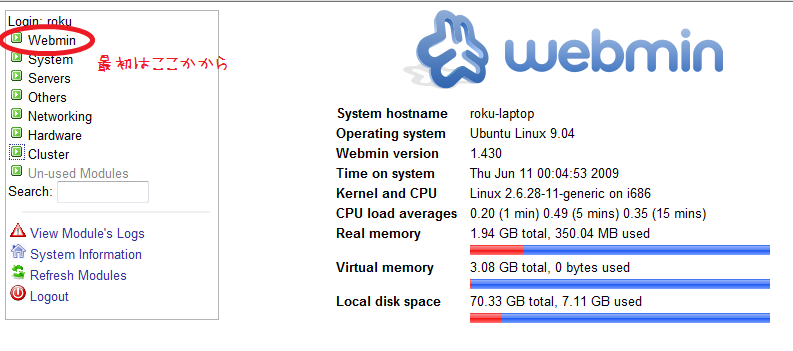 インストールが終わったら、webminに接続してみましょう。