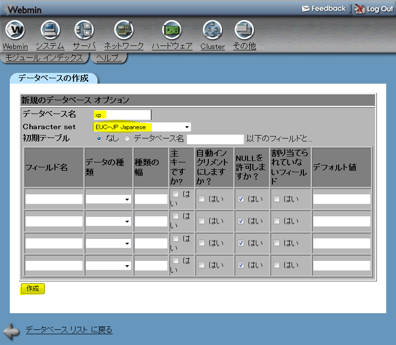 XOOPSの文字コードがEUC-JPなのでデータベースもEUC-JPにします。